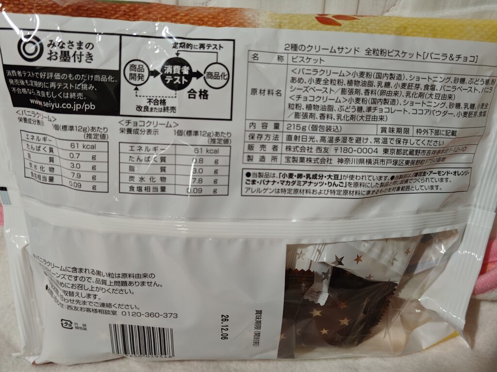 西友で販売されているみなさまのお墨付きの2種のクリームサンド 全粒粉ビスケット〔バニラ&チョコ〕は税込312円で購入できるコスパに優れた一品となっています。